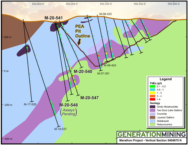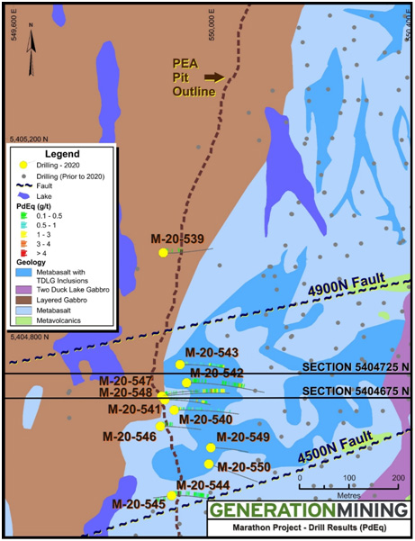 The drill program was designed to test the potential for near surface, ramp accessible mineralization. Results from the first four holes of the program were released on October 29th, 2020. Hole M-20-547 intersected multiple mineralized intervals down dip from the Marathon Palladium Deposit and within the heart of the deposit’s feeder zone bounded by the 4900 N and 4500 N faults. Assay results are shown in Table 1 and a plan view of drill collar locations and 2020 drill program results are included in Figure 1. Section 5404725 N has been updated to include results for hole M-20-547 and is shown in Figure 2.