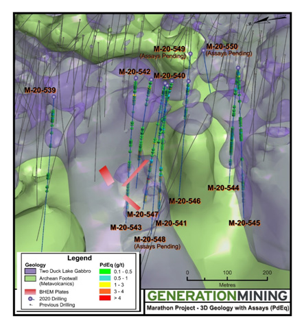 Toronto, Ontario – December 16, 2020 – Generation Mining Limited (TSX:GENM) (OTCQB: GENMF) (“Gen Mining” or the “Company”) is pleased to announce additional results from its 12 hole - 5,068 meter exploration drill program focused on the down-dip western extension of the W Horizon portion of the Marathon Palladium Deposit which is currently the subject of a Feasibility Study.
