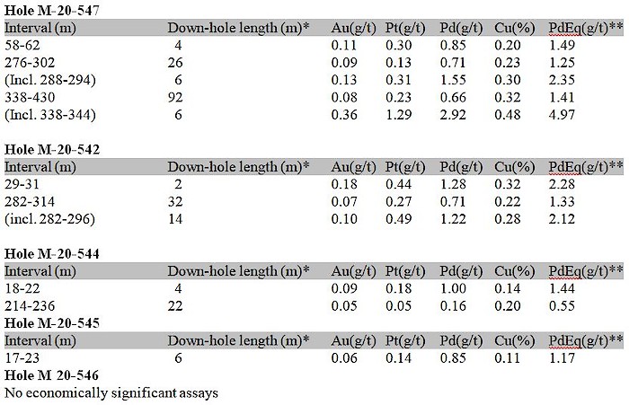 The W Horizon is recognized in the scientific literature as a zone of extreme Pd enrichment substantiating the significance of results from holes M-20-547 and M-20-542. These results confirm the downdip potential for Pd grades of the same magnitude as those intersected up dip (see Figure 2) in holes M-08-423 (2.2 g/t Pd over 12 m), M-07-391 (3.3 g/t Pd over 10 m) and M-08-424 (3.3 g/t Pd over 2 m) previously drilled in 2006 – 2008.